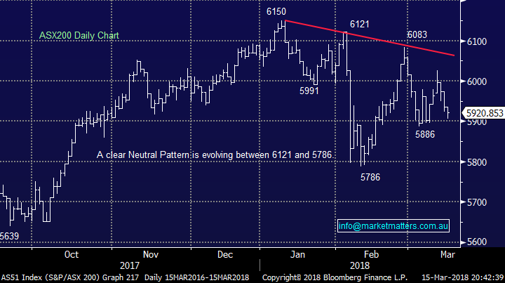 Following Wednesdays close by the ASX200 below 5950 we are now short-term neutral local stocks needing a close back above 6030 to switch us bullish.