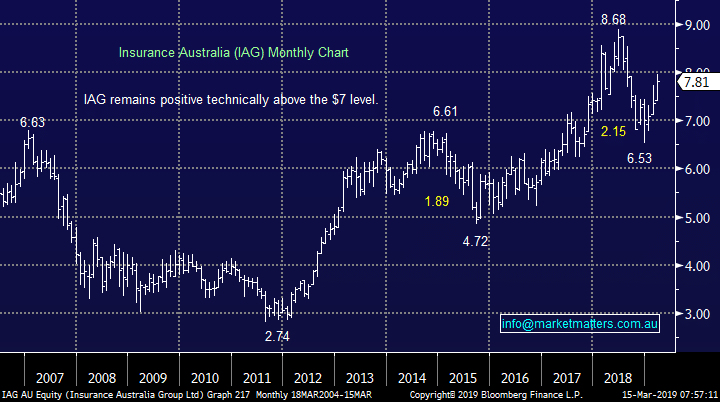 1 Ramsay Healthcare (RHC) $65.05 Private hospital operator RHC has enjoyed a reasonable recovery from its 2018 lows with last months result taking the stock over 10% higher. Last week director Bruce Soden sold over $3m worth of stock at $63.72, the highest price in around 10-months at the time. Sign in to view Ramsay Healthcare (RHC) Chart 2 Orora Ltd (ORA) $3.07 Two directors of packaging business Orora (ORA) have sold shares over last 10-days for a total of $2.5m – the Chairman and MD/ CEO. Considering we have a technical sell set-up targeting another 10% downside and the packaging industry is struggling as a group at the moment we take this as confirmation to leave the stock alone. Orora Ltd (ORA) Chart 3 Credit Corp (CCP) $22.39 Collection and credit management business CCP is within a good month of making fresh all-time highs as the business continues to operate strongly, albeit with some significant share price volatility along the way. The companies Chairman has sold just under $700k worth of stock this month but it follows his pattern in 2018 and the shares have had an impressive 12-months hence we see nothing sinister in this selling. Credit Corp (CCP) Chart 4 Insurance Australia Group (IAG) $7.81 Insurance company IAG is a business MM has been considering buying over recent weeks, potentially as a switch with our QBE Insurance (QBE) holding. So far this month the MD / CEO has sold over $1.8m worth of stock between IAG Finance (NZ) and IAG shares in Australia while an independent director bought a relatively small $100k holding in November. Sign in to view Insurance Australia Group (IAG) Chart 5 Bravura Solutions (BVS) $5.46 BVS provides wealth management software to the big end of town in the financial sector and its offering has clearly been a big hit with the industry as can be seen from its share price appreciation.  However, so far since February 3 directors have sold stock for a total ~$4.3m, this willingness by the board to lock in some money above $5 concerns me, especially for a business with a high P/E of 36x. Technically we would be sellers into fresh highs above $5.70 but remember it’s a statistically dangerous game selling fresh all-time highs. Bravura Solutions (BVS) Chart Market Matters Take/Outlook