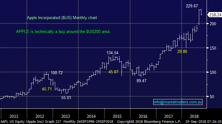 APPLE continues to trade from strength to strength as the business evolves very impressively– APPLE’s cash plie is now approaching $US300bn, meaning that it could almost BUY the big 4 banks in Australia outright! MM likes APPLE in the $US200 region. APPLE (AAPL) US Chart