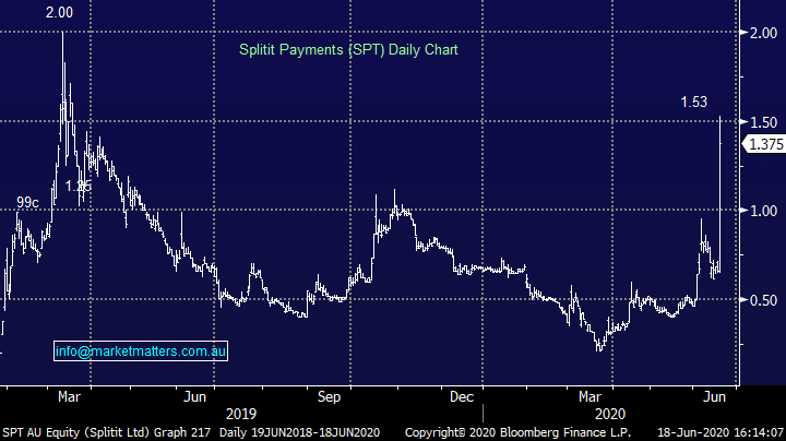 Splitit (SPT) +108.33%: the latest BNPL player to charge higher today, with shares in SPT more than doubling in the session after they announced a partnership with Mastercard. Clearly access to customers and merchants is key in the BNPL space, and the deal could potentially see Splitit capture a wide audience in just a short space of time and easily manoeuvre into new markets – it also sets them apart from the other names in the space. The network partnership bypasses the need to build relationships with each individual merchant – the path that other operators have gone down. There was no financial figure put to the market, but the story ran wild, as did the stock, which more than doubled, though it still trades at a discount to its all time high set soon after IPO early last year. A hot space for the traders. We like OPY & Z1P in the space, looking for a pullback in both to get on board again.