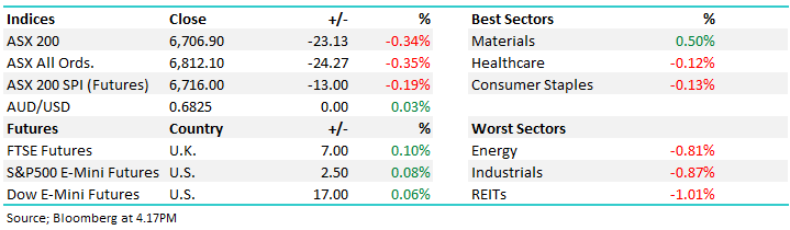 Overall, the ASX 200 fell -23pts /-0.34% today to close at 6706. Dow Futures are trading marginally higher by +17pts/+0.06%