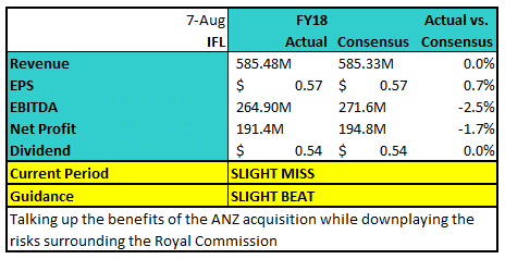 This morning IFL reported their full year results with the stock initially trading down, then marginally higher while at time of writing it’s largely flat. A few interesting elements to the current result however what’s more important here is their commentary about the future and the acquisition benefits derived from their purchase of ANZ’s wealth business – and whether or not we believe them! On today’s result, they missed slightly on EBITDA and profit relative to consensus however there are some wide ranges in terms of analyst numbers on this one. The final dividend was in line with consensus at 27cps however that equates to a 98% full year payout ratio which is clearly unsustainable. Anyway, we’ll call it an inline result for FY18!