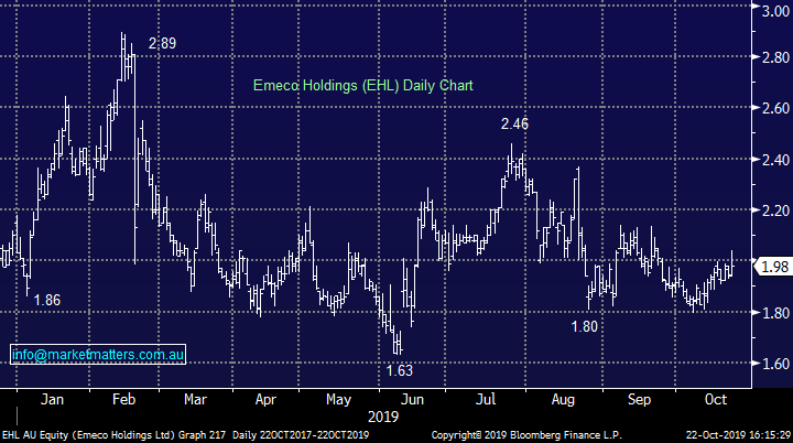Emeco (EHL) +1.8%; Had to address media speculation this morning about a proposed acquisition of BGC Contracting with EHL coming out saying what they always do – they are looking, but its one of many they are running the ruler over and nothing is advanced to warrant disclosure. We own EHL in the Growth Portfolio.