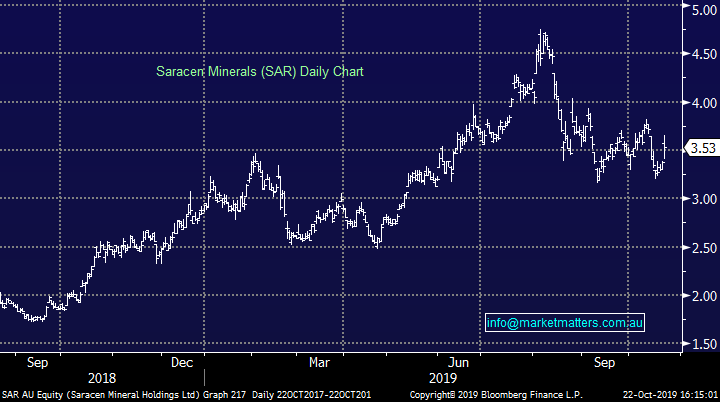 Saracen Minerals (SAR) +4.75%: SAR was out this morning with a good set of 1Q production numbers plus they reaffirmed full year production guidance for 350,000 to 370,000 oz. 1Q gold production came in at 96,324 oz on an all-in sustaining costs/oz of A$964. For the full year they still expect an all-in sustaining costs/oz A$1,025 to A$1,075. They announced an inaugural dividend policy to apply from FY20, targeting a payout equal to 20-40% of NPAT, subject to a few conditions being met which includes reaching and maintaining a minimum cash balance of A$150m