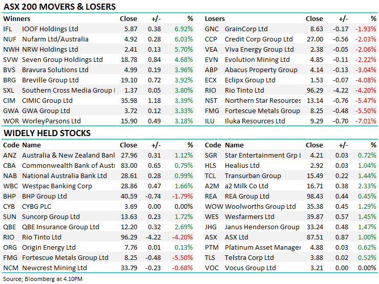 Major Movers Today – IOOF (IFL) rallied on an impressive jump in FUMA – up 18.7% on the prior year. The bulk coming from their ANZ Wealth acquisition, but a ~6% organic growth is far better than expected.