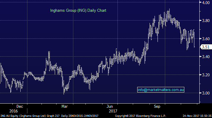 The fall is a classic example of what happens to a stock trading on a high valuation which suddenly disappoints the market. However, we do not see major concerns within the business at this stage and the current P/E of 20.8x Est 2018 earnings is rapidly becoming more attractive – the 1.78% fully franked dividend is clearly not exciting at this stage, it’s all about potential capital appreciation. One of the themes we’ve witnessed in more recent times is follow through selling on downgrades for a few days after. The WEB downgrade happened on Wednesday, following through selling yesterday and often stocks find a low on the third day.