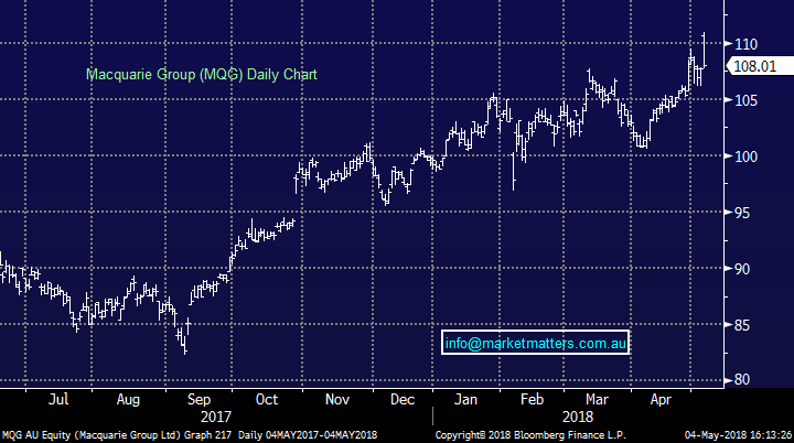 Macquarie (MQG) $108.01 / +0.24%; Another impressive result for the bank this morning, coming in ~3% above guidance & consensus with NPAT at $2.557m – up 15% year on year - and EPS a huge 7% above consensus at 758cps. The result was underpinned by keeping a lid on costs and performance fees coming in above expectations. Investors were also treated to a larger than expected dividend, paying $3.25/share with 45%, which represents a payout ratio of 70% - likely driven by the tier 1 capital ratio rising to the top end of the range. As has been the case for the past few results, Macquarie has guided to no growth to 2019, consistently understating performance.
