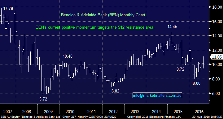 3. This morning we purchased Bendigo Bank (BEN), our "Standout Chart" from the weekend report and we’re very happy to see the stock rally 22c (2.1%) intraday, to close at $11.05. As we have been discussing recently, we feel it's time for the banks to outperform in the ASX200 and BEN looks a standout at present, especially with a 34c fully franked dividend looming in early September.
