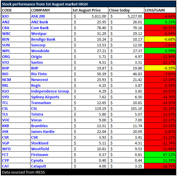 Well held defensive names have suffered in this sell-off – which has not been the case during recent market declines. Think Sydney Airports (SYD) which is down -14.7% and Transurban (TCL) which has fallen 14.55%. Compare that with BHP, which is a ‘risk on growth stock’ and it’s pretty much flat over the period of this decline. Golds are actually starting to look interesting again with Newcrest (NCM) down 17% from its Aug 1 high – near a decent entry point it would seem