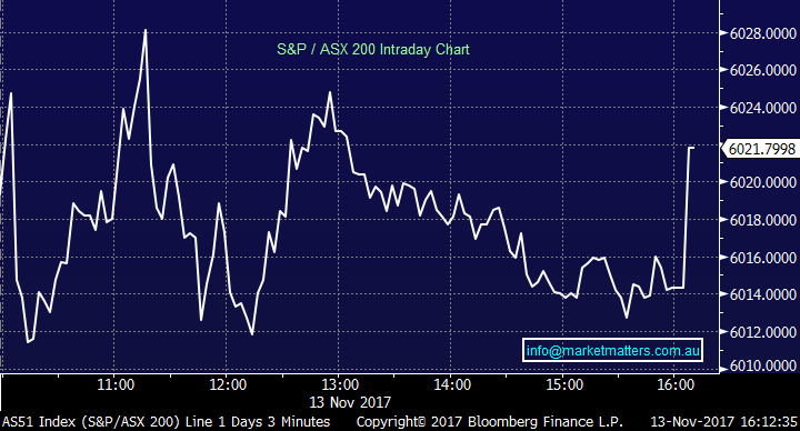 The market had a go at selling off on a few occasions today and failed - the buying in the match which saw the index up +8 points from 4pm to 4.10pm highlighting that there was simply a void of sellers in what proved to be a pretty quiet day of trade. Overall, the Material stocks did best, BHP and RIO bucking weakness in their overseas counterparts on Friday, probably a result of higher Iron Ore prices in Asian trade today while most weakness was felt in the IT space – a tight range today of +/- 18 points, a high of 6029, a low of 6010 and a close of 6021, down -7pts or -0.13%. As we wrote on the AM report, we continue to think a short term pullback seems likely but to date, it’s been stubborn – another example of that today.