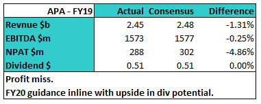 APA Group (APA) +2.95%; The gas pipe owner operator rose despite a slight miss on the profit line today. Profit growth of around 9% was driven by new assets coming online and pricing structures in a number of contracts which saw a reasonable increase in income. Outlook for FY20 was in line with estimates, while upside can be seen in distributions with APA currently running a relatively low payout ratio.