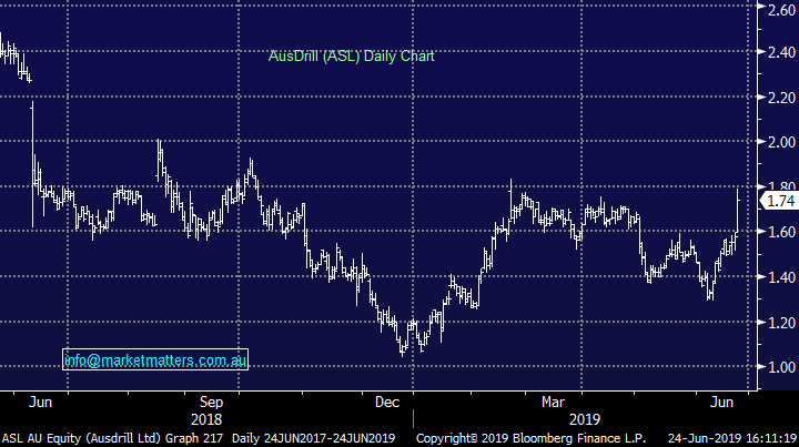 The contract further validates Ausdrill’s push into the international mining market and the acquisition of Barminco that was completed late last year is already paying dividends. To put this contract into perspective, revenue for Ausdrill in FY18, prior to the Barminco acquisition, was around $1bn with EBITDA margins of around 20%. We own ASL in the Growth Portfolio targeting the $2 area.