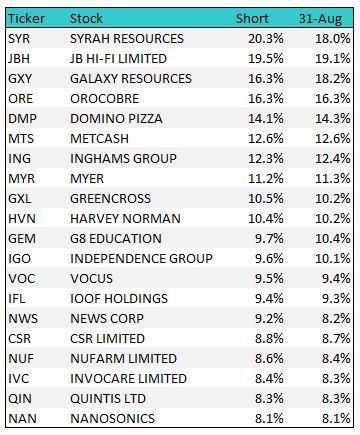 Short Interest; a quick look at the short interest post reporting season, the consumer names have clearly jumped higher as the market becomes increasingly negative household debt/interest rates/house prices, while battery input companies also dominate the list. Graphite prdocuer Syrah returned to the top of the list – it has been heavily shorted for some time, hovering around 20% mark with the company short on capital while looking to develop a battery anode plant in the US. Lithium names Galaxy & Orocobre come in 3rd & 4th, although GXY has recently seen some short covering. The rest of the top 10 is all consumer facing stocks with most seeing short interest increase over the first week of September.
