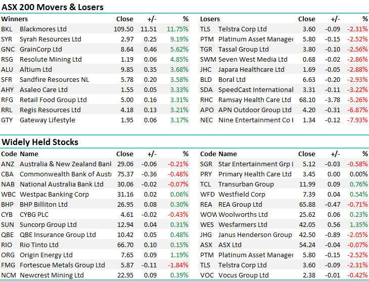 A choppy session played out in on the Aussie mkt today with the index ticking in and out of positive territory before closing marginally higher – Telstra took 9.36 index points from the 200 today after trading ex-dividend (more on that below) while we saw another day of BIG stock moves from companies that reported earnings. Overall, the Supermarkets did best, Wesfarmers the standout adding +1.35% to close at $42.05 while the Telcos provided most drag on the back of Telstra (TLS) – a range of +/- 36 points, a high of 5691, a low of 5654 and a close of 5669, up 0.7pts or flat.
