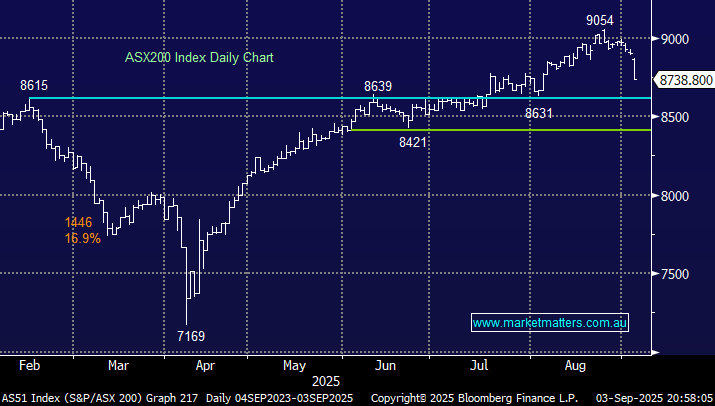- Over the last decade, the ASX200 has fallen 80% of the time in September and 60% in October; the largest loss for a September over the last decade is 5.9%; we’re already at -2.6% in 2025!