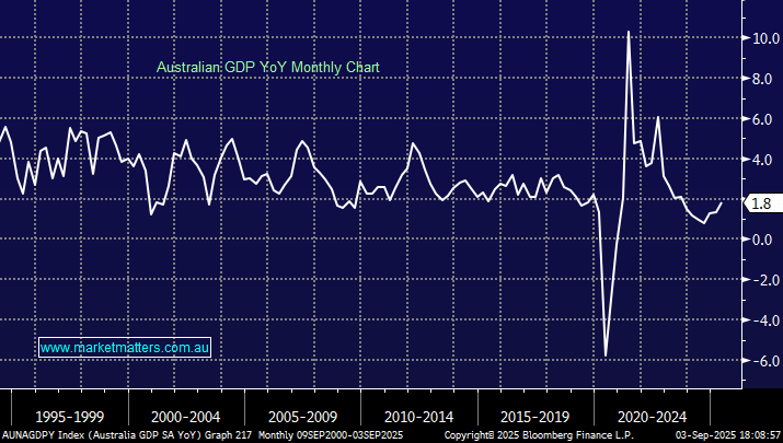 Stronger-than-expected GDP figures saw local interest rate cut bets dialled back on Wednesday. The Australian economy grew by 0.6% in the March quarter and 1.8% over the past year. Household spending, especially on hospitality and travel, was a key driver of growth. The savings rate fell following interest rate cuts in February and May, as households opened the purse strings on more non-essential purchases. Markets still ultimately expect the RBA to cut rates down to a pivotal rate of 3.10%. However, at this stage, with employment strong and inflation still bubbling below the surface, this is the best-case scenario in our opinion unless the economy slips into reverse.