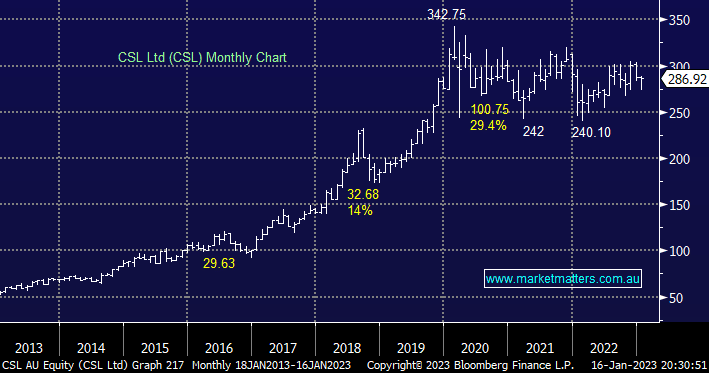 CSL is now the local market’s 3rd largest company with a market cap of $138bn, Australia’s most successful biotech/healthcare stock remains well below its 2020 high very much in line with the majority of the growth sector following the recent rally by the global bond yields. The company has done nothing wrong but international equities have seen a revaluation of the growth names due to the mentioned rising bond yields.