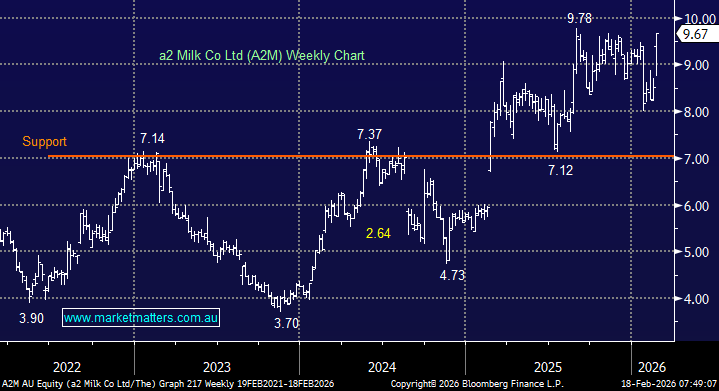 Previous investor favourite A2 Milk (A2M) has rallied toward five-year highs this week following a well-received first-half result that defied China’s declining birth rate – its most important market. An expanded product range in China drove revenue well ahead of expectations, prompting the company to upgrade its full-year guidance. While China’s birth rate remains at record lows, a structural headwind for the business, A2M has demonstrated an ability to offset demographic pressure through product innovation and brand strength.