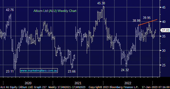 ALU has struggled compared to its peers over recent weeks as buyers appear to have gone in search of bargains as opposed to chasing the top performers. This Printed Circuit Board (PCB) design platform reported excellent FY22 results last August, revenue was $221m and EBITDA $81.1m while their FY23 guidance was also significantly better than consensus hence it’s unlikely we will be selling this particular holding into weakness.