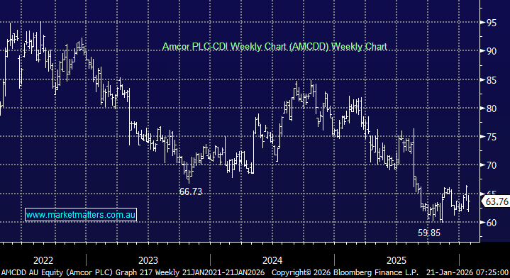 AMC implemented a 1-for-5 share consolidation. This means every five existing Amcor shares were combined into one new share, reducing the total number of shares outstanding from about 2.3 billion to around 461 million. The prevailing price goes up 5 fold, having no material impact on our holding. Deferred settlement takes place during this time, with AMC temporarily trading under code AMCDD, before reverting back to AMC on the 21st January. Trading platforms can have an issue with the change which may distort pricing. This will revert to normal tomorrow.