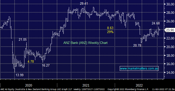 ANZ has been the ugly duckling this year falling over -12% while WBC is currently up +1% and not surprisingly it’s the cheapest of the “Big 4 Banks” trading on an Est P/E of 11.2x with an Est yield of 6% over the next 12-months i.e. a theoretically higher risk and return. If we were going to switch from CBA our capital would probably find itself in Westpac, or NAB which resides in our Hitlist, as opposed to ANZ which needs to get more runs on the recovery board.