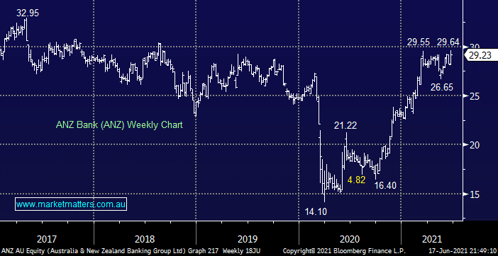 Commonwealth Bank (CBA) is garnering most of the headlines for the Australian banks as it soars above $100 to fresh all-time highs. However the whole sector is coming along for the ride as higher bond yields should produce improved margins for the sector, plus of course they are now incredibly well capitalised and primed for capital management as COVID provisioning unwinds. ANZ Bank (ANZ) for example has more than doubled from its COVID panic sell off but from a risk / reward perspective we wouldn’t now be keen buyers until we witness a ~8% pullback.
