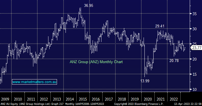 ANZ is the only banking stock to shrug off the recent “Banking Crisis” to trade higher in 2023 albeit, by a minor +0.5%, the stock is forecast to declare an enticing 72c fully franked dividend in early May. ANZ still looks inexpensive in our opinion relative to its peers and when combined with its strong competitive position being more institutionally focused keeps it as one of our preferred sector plays.