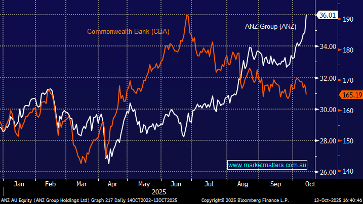 CBA was driven higher by momentum traders into the EOFY, pushing it up to ~$190/sh, but ever since, it has peeled away, closing ~14% below this year’s high on Monday. While CBA is by no means ‘cheap’, it’s cheaper than it was a few months ago, and clearly some of the momentum money has exited. We still prefer ANZ, even after recent outperformance, believing it has greater ‘self-help’ upside relative to CBA, and the 10 PE point premium held by CBA could further erode. That’s not to say that CBA should not trade at a premium, it has a better technology stack positioned more favourably for the world of AI, however the current premium still feels excessive.