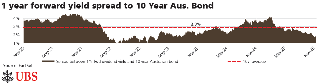 We discussed APA Group (APA) in a Q&A last week (here), highlighting APA’s spread over 10 year yields as our primary indicator on this stock. In the answer, we highlighted it’s spread vs US 10 year yields (global benchmark for rates) at 2.2% (APA yield exp at 6.2%). Since then, UBS highlighted this indicator relative to Australian 10-year yields, which trade around 40bps higher than their US counterparts, as they reinforced their sell rating on the stock. There is no doubt APA is now on the more expensive side of history as the below chart highlights, and we see less growth upside in this holding, though in absolute terms, a 6.2% partially franked yield remains attractive in the Income Portfolio (but less so in the Growth Portfolio).
