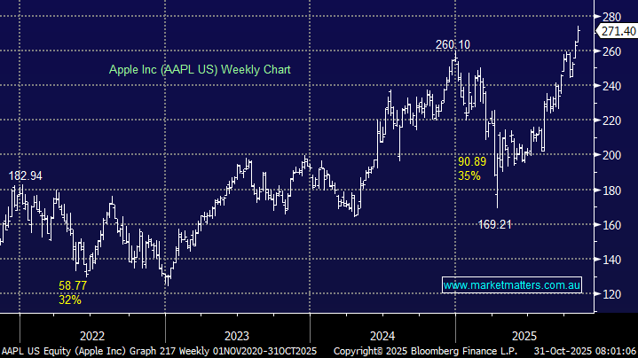 Apple reported stronger sales ahead of the holiday season although China revenue for the 4th quarter missed expectations. The stock advanced ~5% in late trade as a fired-up Tim Cook pointed out that there was no increase in previously flagged AI spend and the company is making great progress on the new Siri, coming next year, while CFO Parekh delivered an upbeat forecast for the holiday season –  saying revenue will gain 10% to 12% in the December quarter, signalling that the iPhone and other Apple products will have a strong Christmas season.