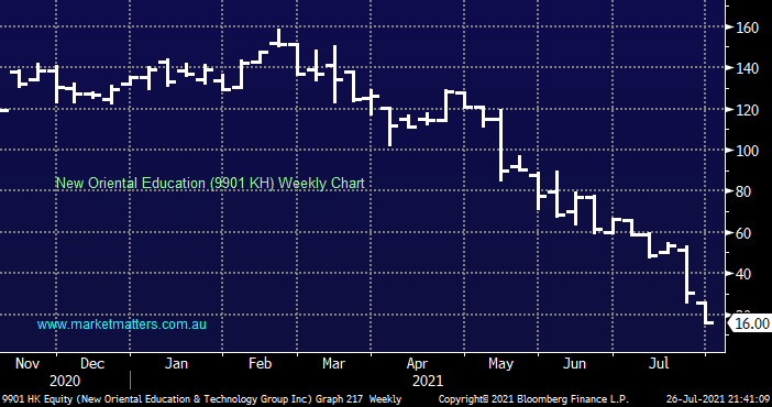 This dramatic move towards education was way more than a muscle flex by Beijing and the market listened big time with Larry Chen’s on-line education company (9901 HK) halving on the day, taking their descent to 98% from their February high, costing their founder his billionaire status in the process. Chinas move is actually a fairly logical one, they’re attempting to curb the spiralling educational costs that are discouraging families from having more kids, as we’ve seen locally with Treasury Wines (TWE) you simply don’t want to stand in the way of Chinese policy.