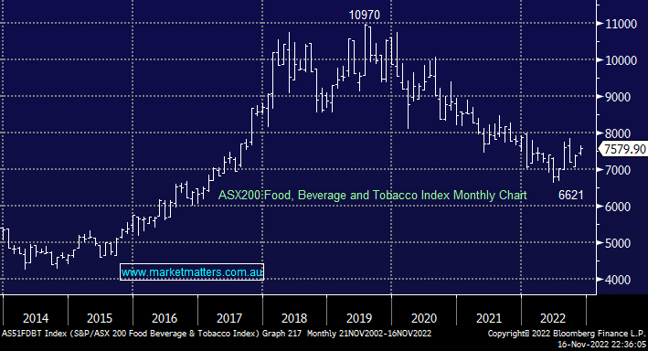 Before we bore down into some major stocks in the sector we’ve taken a quick look at the overall Food, Beverage & Tobacco index, although this contains a very diverse group of companies that rarely move as one e.g. year to date Bega Cheese (BGA) is down -42% while a2 Milk (A2M) is up +10%. We believe the risk/reward for the index is finally pretty good after a tough 2022 but clearly, it’s on the stock level where we need to identify some opportunities.