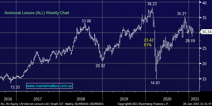 Aristocrat (ALL) has also been on our radar following its 19% pullback from Novembers high. Unlike CTD we think ALL may have already reached its pullback target area and be a buy now.