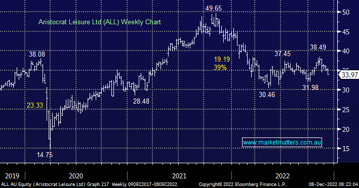 Aristocrat (ALL) is not an obvious pick as a consumer discretionary company but it makes money from gaming machines and their operations hence even while gambling can unfortunately often be one of the last spends people cut it will be curtailed if tough times persist.