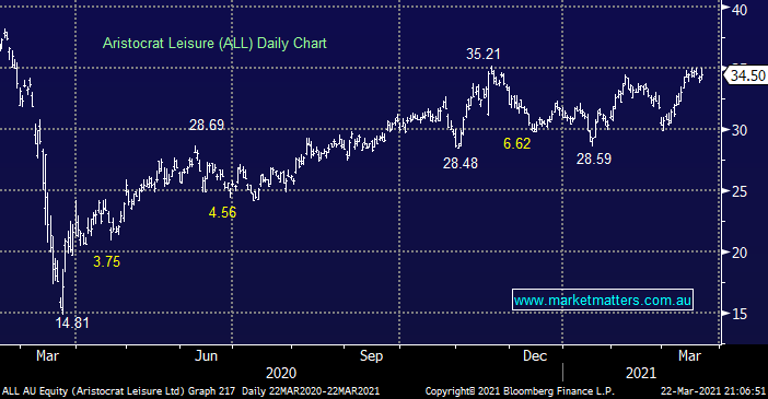 MM holds ALL in its Growth Portfolio, the gaming business keeps threatening to pop above $35 only for the sellers to regain control, yesterday it reached $35.02 before surrendering half of the days gains. At this stage we are still expecting an aggressive rally to new post COVID highs but it’s a move we are considering fading – at this stage this is another set-up which adds some confidence to our short-term patience towards stocks in general, before we consider migrating further down the risk curve.