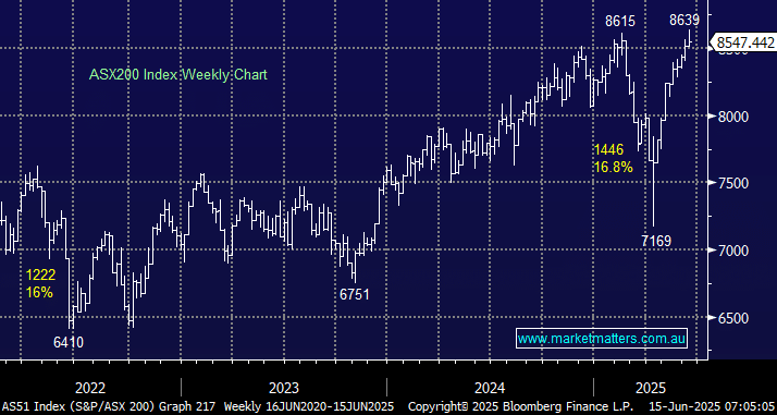 The ASX200 advanced +0.1% last week, but after five consecutive weekly gains, it appears likely to be harder to add to the move this week, with plenty of good news built into markets, plus the uncertainty around the Middle East weighing on sentiment. We shouldn’t forget the markets already surged over +20%, posting new all-time highs last week. Remembering that historically, July is the seasonally strongest month of the year, and MM is looking for the index to rally into Christmas, we will be looking for buying opportunities if the market spikes lower in the coming weeks.