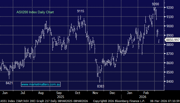 The ASX200 posted new highs on Monday afternoon only to close down 3.8% by Friday with a weekly 8.5% drop by the materials sector weighing heavily on the index with much of the same likely today. After the miners it was the rate-sensitive names that were on the receiving end of the selling as inflation concerns swept through global markets, with the consumer discretionary and real estate sectors both retreating by more than 4%. We wouldn’t be surprised to see concerns around the Middle East drag the ASX200 back towards 8400 support, only 3-4% lower than where its expected open this morniung.