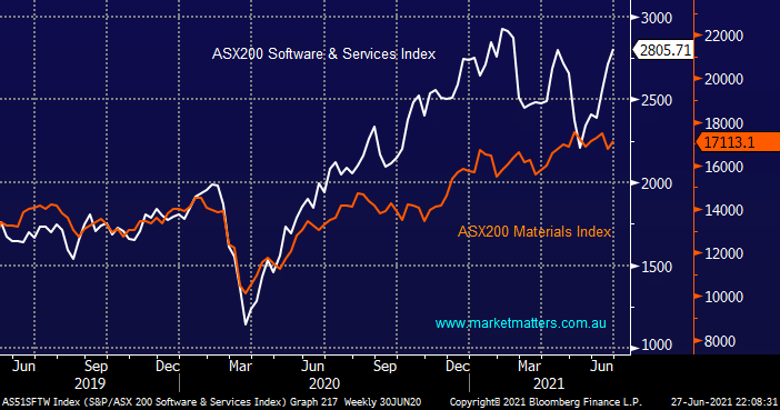 Last week we looked at the major outperformance the IT stocks have enjoyed over the Resources since mid-May, its been good to us as we’ve migrated our Growth Portfolio to a significant overweight stance towards the tech sector. A couple of relevant points a few days before the EOFY: