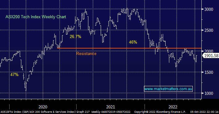 The Australian Tech Sector enjoyed another strong session on Wednesday finally closing up +3.9% but when we consider its 46% plunge in less than 12 months it remains a mere drop in the ocean – we are looking for another +15% upside minimum although over 20% wouldn’t surprise us. Obviously, as we’ve seen over the last few days for this view to unfold markets probably need to see central banks continue to soften their hawkish views i.e. our core view into Christmas that the acceleration higher by interest rates is coming to an end.