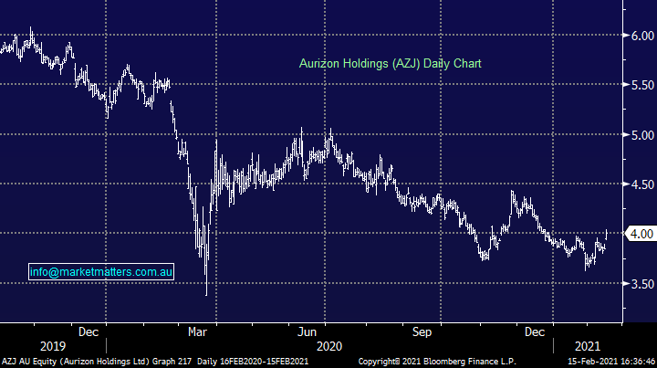 Aurizon Holdings (AZJ) +3.9%: traded higher on their first half result today. EBIT a slight beat of 3% at $454m the main number in question. Coal volumes have been weak to start the year, tracking around 10% below last forcing Aurizon to downgrade haulage expectations for the full year by ~5% to 200-210mt before a rebound in FY22. The bulks side of the business continues to do well with revenues up 8%. There remains around $50m in the buy-back kitty (out of the $300m buy back), which could also be topped up with the sale of their Acaciaridge Terminal on track for completion in March. This is a deep value coal exposure that would potentially fit in the MM Income Portfolio with a forecast yield of ~7%.