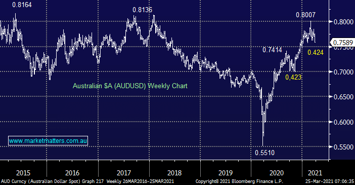 The local currency is a great indicator of the global economy, its regarded by most market participants as a proxy for economic growth similar to Copper. The chart below illustrates how since last March the “Aussie” has already rallied 45%, reaching levels way above when the coronavirus was even discussed. When the $A was around 80c we moved to short-term bearish stance targeting a 4-5c correction, this has now been achieved moving us to a mildly bullish stance and at this stage we believe the $A will rotate between 75 and 82c through 2021.