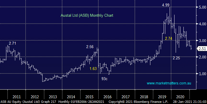 Lastly Austal Ltd (ASB) which is a new one for subscribers in 2021, this leading local defence contractor is a globally recognized commercial and defence shipbuilder with its main facility in Alabama. This is a strong business with ~$300m cash on its balance sheet positioning it strongly for future growth assuming nobody takes a fancy to it of course. Since halving in value, we feel the stocks simply gone too far with its sustainable 3.2% yield which is not to be sniffed at.