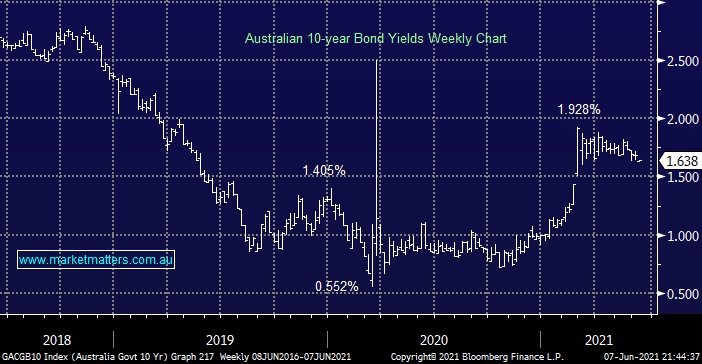 Local bond yields continue to drift lower even while the press is full of inflation and rising interest rates / bond yields. As we mentioned above Bank Bill futures are forecasting the RBA Cash Rate to be at 1.1% by mid-2024, interestingly when we last saw rates at 1% in 2019 the Australian 10-year bond yield was trading under 1.5% implying there’s a fair bit of inflation / rate hikes already built into longer dated bonds.