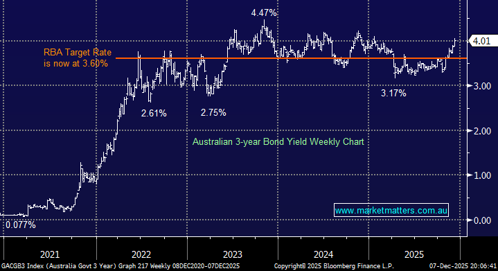 The Australian bond is falling (rates higher) as would be expected when rate hikes are suddenly being priced in after further cuts were expected since the last cut in August – a 180 reversal of sentiment. The 3s are now trading 0.4% above the RBA cash rate which feels about right to us while we wait on future economic data.