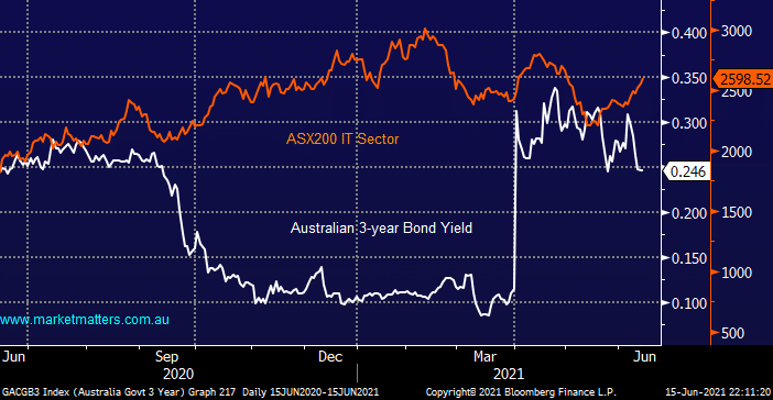 The ASX200 IT Sector has led 3-year bonds in 2021, slipping lower in a rising market before bond yields started rising and then recovering before the same yields started giving up some of their gains for 2021. At this stage we have no reason to believe the Healthcare & IT stocks wont outperform Resources / Banks over the coming months as we see some ongoing sector and performance rotation. Until further notice we will be watching the IT Sector for read through on bond yields.