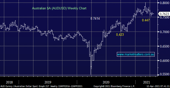 Not a lot of new news for the $A this week as it tracks back to the bottom of our targeted trading range which sits between 76c – 81c, hence by definition we are bullish short-term on the local currency which coincides with our bearish $US view.