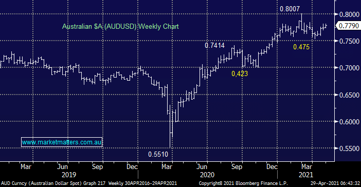 The Aussie Dollar actually closed higher yesterday even after the inflation data appeared to put rate hikes on ice but the appreciation was more about the $US making fresh 9-week lows than the local story. The analogy of the AUD being simply a cork floating in a big currency ocean rings true. Our ideal scenario is the $A tests above 80c one more time before correcting.