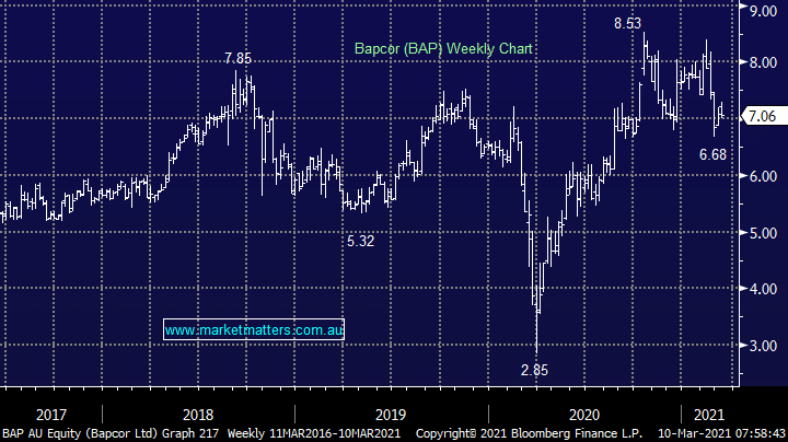 The car & truck parts business has been a big beneficiary of border closures and lockdowns with the stock performing strongly since it was added to the portfolio. With the secondary car market running hot, BAP may still have some headroom in terms of earnings, likely to see some growth even as international travel opens up towards the end of the year. Technically, the stock is a buy ~$6.50 and a sell ~$8.50.