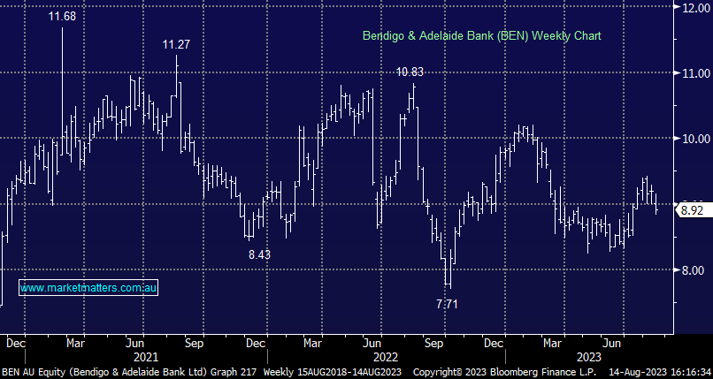 BEN -2.94% A miss at the earnings line drove a decline in the share price today, although it wasn’t all bad news for this regional lender. Cash net profit after tax (NPAT) of $282m was a ~5% miss to the $299m expected while the FY23 dividend of 61cps was around 1% ahead of consensus. Their capital position was solid while impairments of $28m were also as expected – and low given our point in the cycle. They did better in the 2H with net interest income (NII) of $843m ~4% ahead, underpinning better net interest margins (NIM) which increased 8bps to 1.94% – a return to loan growth + better NIMs HoH (despite -5bps in Q4) are the key positives to take away from the result. Asset quality, as was the case with CBA, remained sound despite all the doom and gloom.