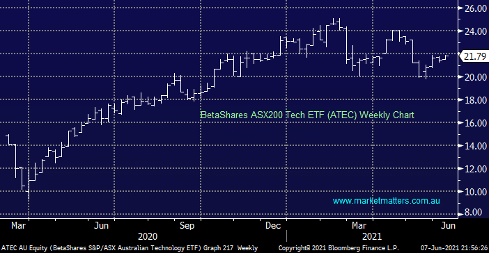 One excellent way to “play” our view towards Australian tech is via the BetaShares ASX200 Tech ETF (ATEC), buying this $190m ETF alleviates the individual stock risk in this volatile space e.g. 50% of the sector has fallen more than 10% in 2021 with the worst 3 averaging a decline of 45%. Clearly with so many IT stocks struggling in 2021 there’s plenty of room for at least a few strong bounces in a market where investors are finding it increasingly difficult to identify value.